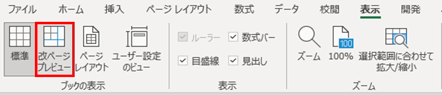 「表示」タブをクリックし、「改ページプレビュー」ボタンをクリックします。