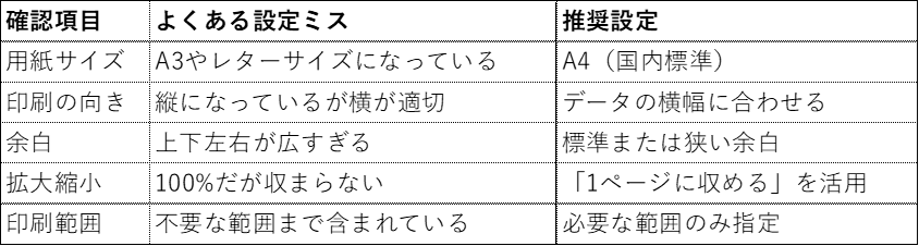 用紙サイズをA4に設定しているつもりがA3のままになっていたり、余白が広すぎて印刷領域が狭まり余計なページが増えていたりするケースは非常によく見られます。