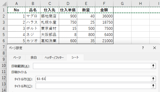 シート上でヘッダーとして各ページに繰り返したい行(例:1行目)をクリックすると「$1:$1」のように自動入力されます。