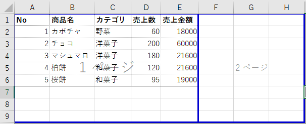 改ページプレビューに切り替わると、印刷ページごとに区切られた状態でシートが表示され、各ページに「1ページ」「2ページ」と表示されます。