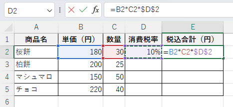 E列の税込合計はB列の単価×C列の数量×D2の消費税率(1+税率)で計算しますが、D2セルの税率を固定しないと数式をコピーしたときにD3・D4とずれてしまいます。