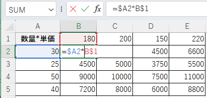この数式を表全体にコピーすると、行方向にコピーしたときは数量の行参照がずれ、列方向にコピーしたときは単価の列参照がずれることで、正しい掛け算表が完成します。