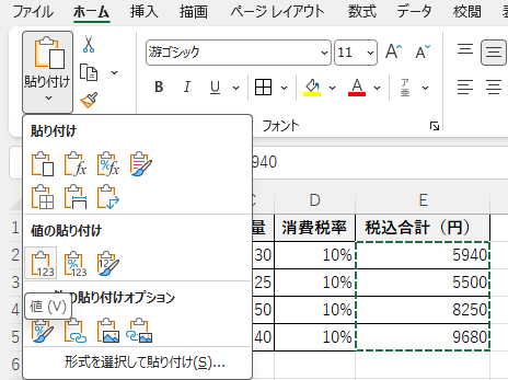 これで数式が削除され、計算結果の数値だけが貼り付けられます。