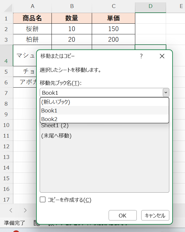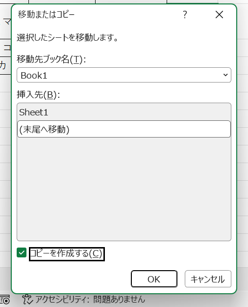 コピー先のブックを選択してから挿入先の位置を指定し、「コピーを作成する」にチェックを入れてOKをクリックします。