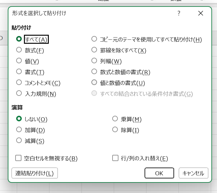 「すべて」を選択してOKをクリックすると数式・書式・値がすべて貼り付けられます。