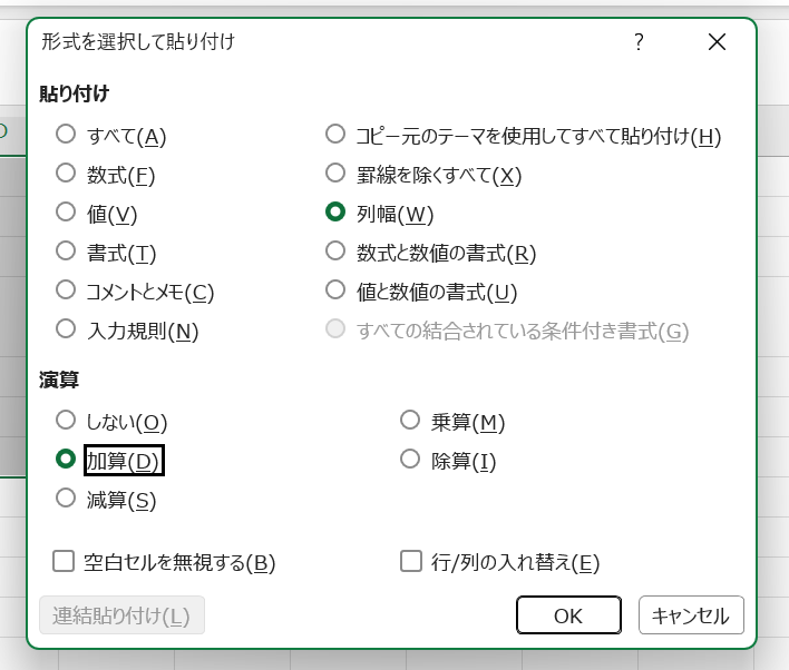 続いて列幅を再現するために再度Ctrl+Alt+Vを開き「列幅」を選択してOKをクリックします。