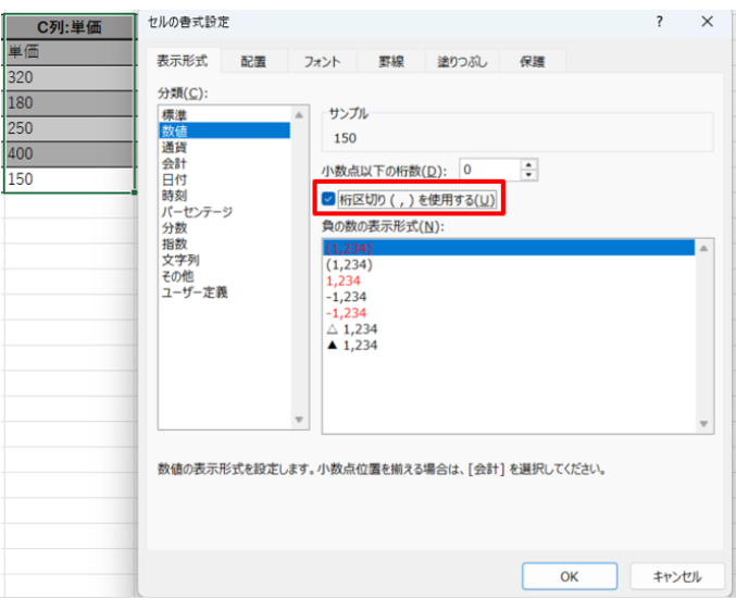 「表示形式」タブで「数値」を選び、「桁区切り(,)を使用する」にチェックを入れてOKをクリックします。