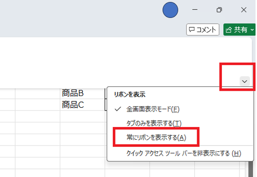 この時に画面右上に出てくる「リボンの表示オプション」ボタン(下向き矢印アイコン)をクリックし、「常にリボンを表示する」を選択します。