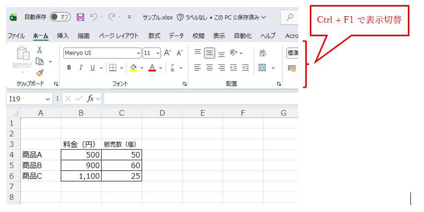 ・Ctrl + F1のショートカットキーでリボンを表示できる