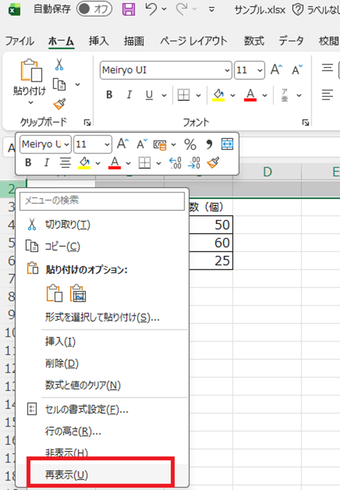 非表示行の前後の行番号を選択→右クリック→「再表示」で非表示行を表示できます。行番号が連続していない場合は、行が非表示になっている可能性を疑いましょう。