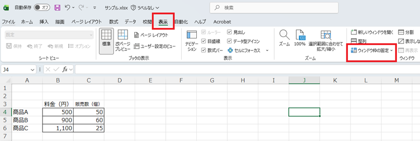 「表示」タブをクリックして、「ウィンドウ枠の固定」ボタンを確認しましょう。
