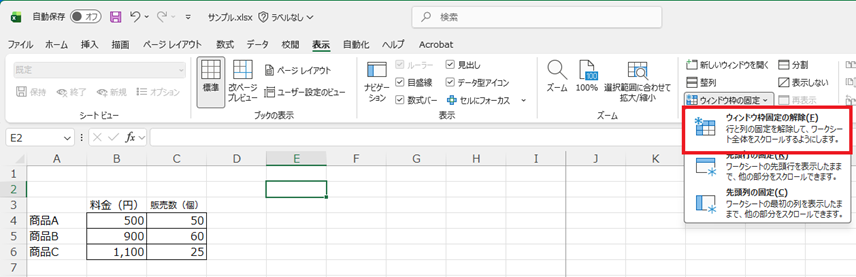 これで、ウィンドウ枠の固定が解除され、通常のスクロール表示に戻ります。