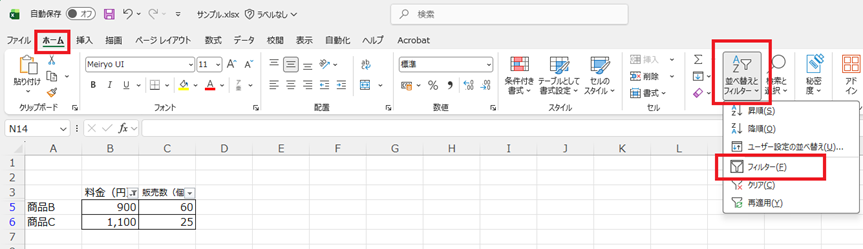 「データ」タブをクリックして、「フィルター」ボタンを確認しましょう。