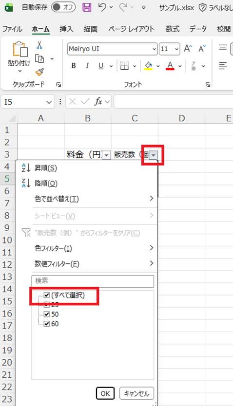 フィルター機能を使い続けたい場合は、各列のフィルターボタン(▼マーク)をクリックして、「すべて選択」にチェックを入れることで、すべての行を表示できます。