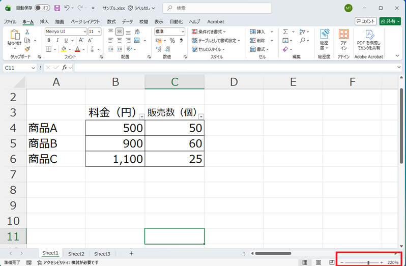 画面右下のズームスライダーまたは「表示」タブの「ズーム」で倍率を100%前後に調整します。「Ctrl + マウスホイール」で素早くズーム調整できることも覚えておきましょう。