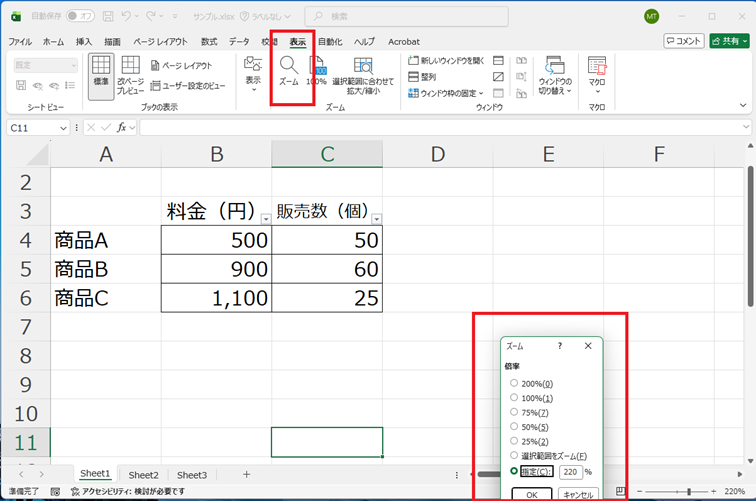 もしくは、「表示」タブの「ズーム」ボタンをクリックして、数値を直接入力することもできます。