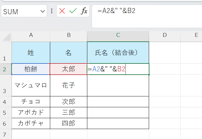 この数式はA2セルの内容・半角スペース・B2セルの内容をこの順番で結合します。