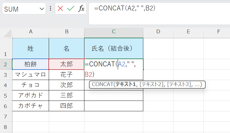 CONCAT関数は「=CONCAT(A2,” “,B2)」の形で使い、結合する要素が多い場合に数式が読みやすくなります。