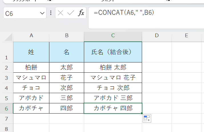 エクセルでスペースを入れる方法2【CONCAT関数でスペースを挟んで結合する】