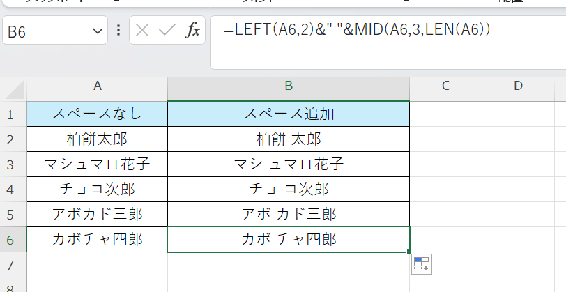 たとえばA列の氏名データ「柏餅太郎」(スペースなし)の姓と名の間にスペースを挿入したい場合は、姓が2文字固定であれば次のように記述します。